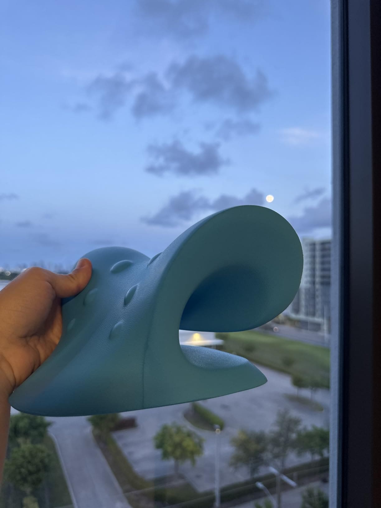 Sí. Su diseño ergonómico estira y descomprime suavemente las vértebras cervicales, aliviando tensión acumulada por malas posturas o largas horas frente al computador.
